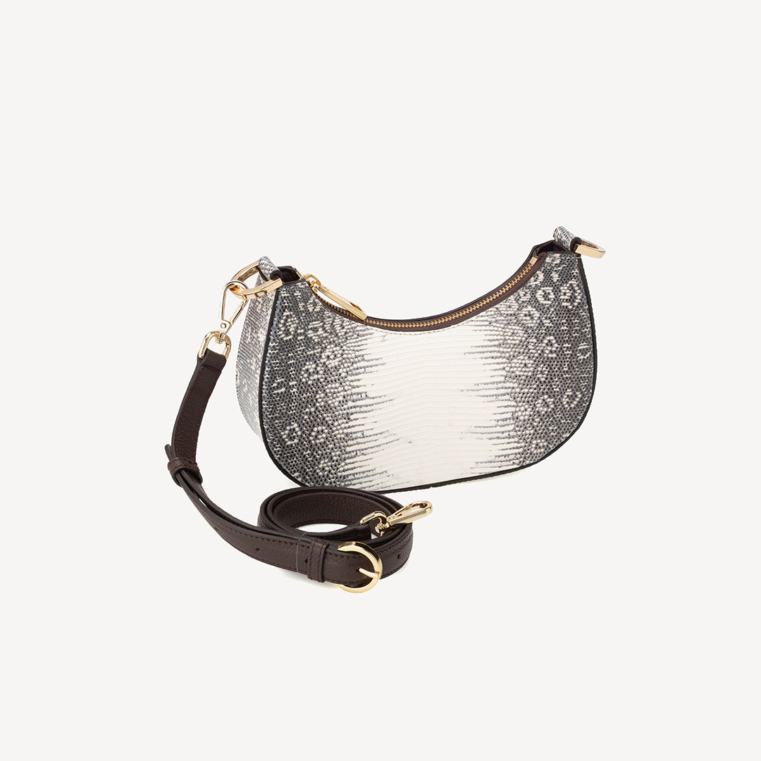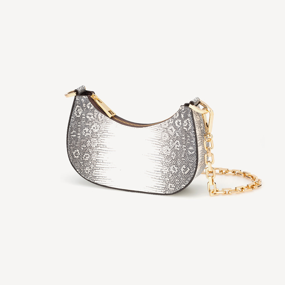 This modern and sophisticated crescent shape gives you the ability to wear for all occasions with great capacity: Lizard leather, NATURAL BEIGE, Himalaya, gold finish. The detachable and sculptural shoulder chain will completely elevate your look. The detachable and adjustable crossbody strap makes this bag a fantastic hands free silhouette. The zip top closure keeps all of your items safe and secure.