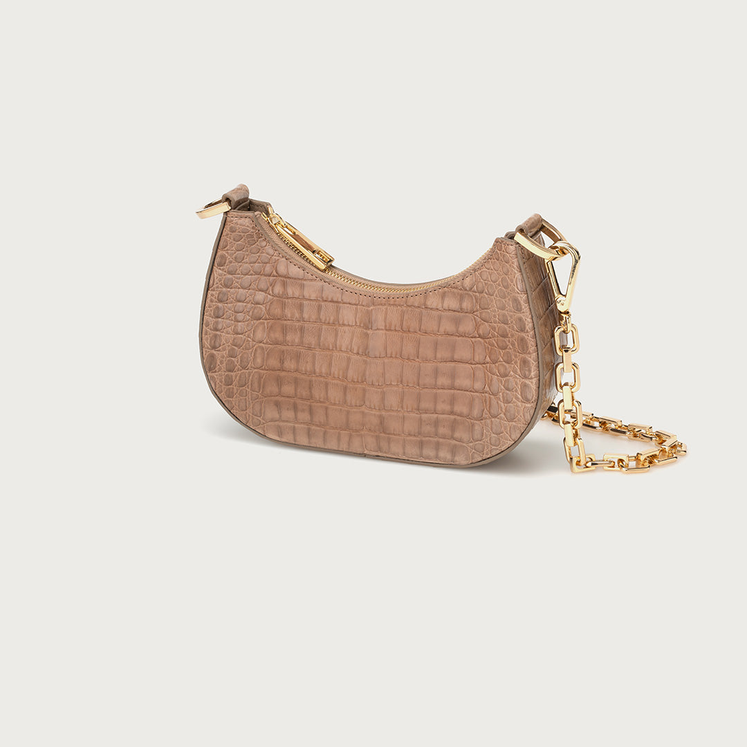 This modern and sophisticated crescent shape gives you the ability to wear for all occasions with great capacity: Crocodile leather, ALMOND BROWN, glazed, gold finish. The detachable and sculptural shoulder chain will completely elevate your look. The detachable and adjustable crossbody strap makes this bag a fantastic hands free silhouette. The zip top closure keeps all of your items safe and secure.